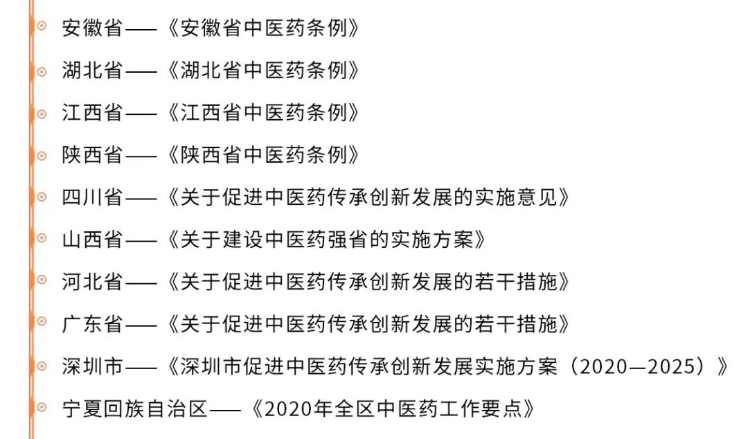 在《意见》的明确要求与指引下,各地政府纷纷响应中央的号召, 相继出台地方性政策加速推进中医药传承创新发展。
